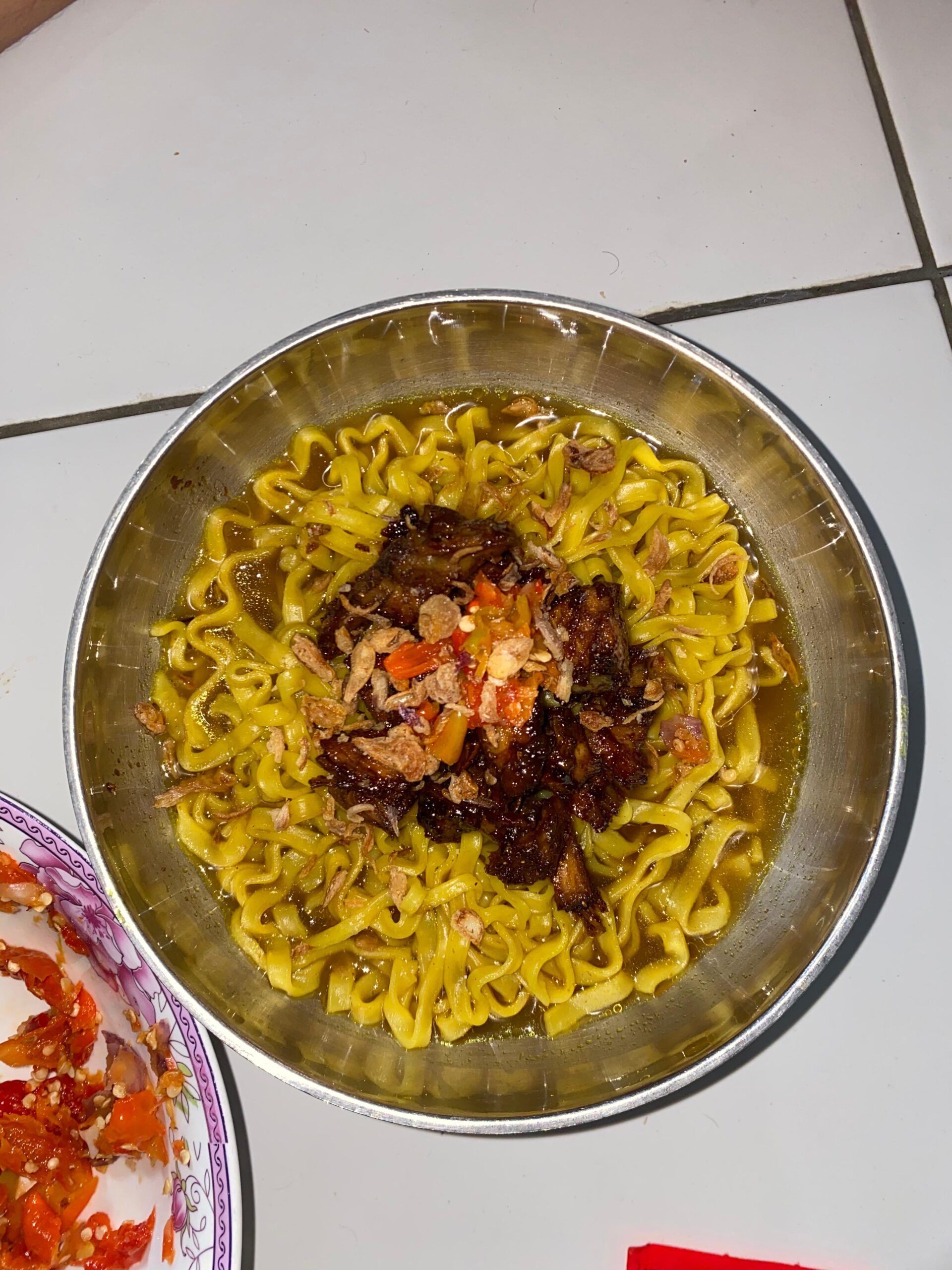Mie kenyal buatan sendiri dengan ayam berbumbu khas, disajikan hangat untuk pengalaman mie ayam yang lebih personal dan nikmat.